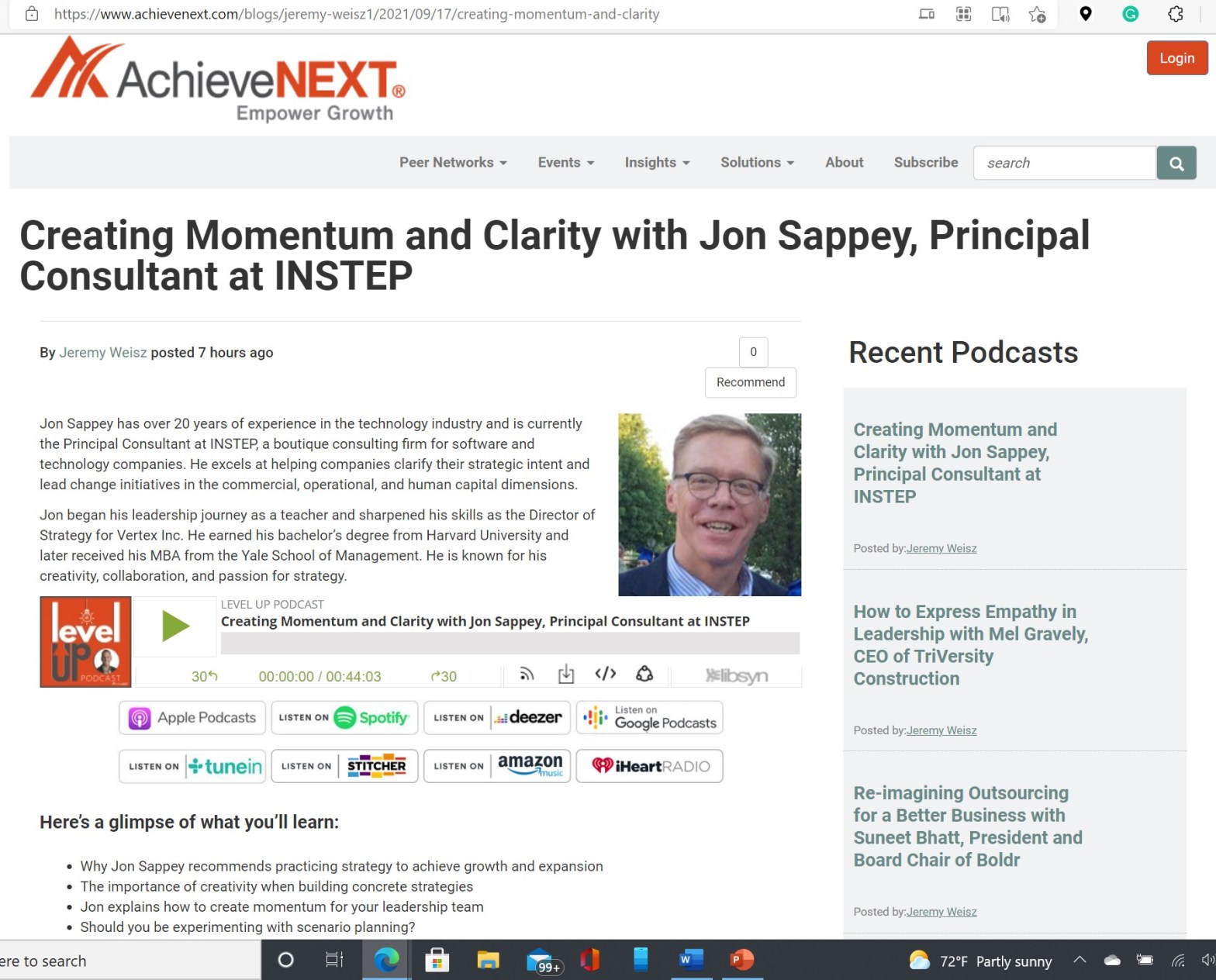 I was delighted to be a guest on the CFO Alliance’s Level Up podcast, talking about how practicing strategy creates clarity and momentum in organizations. Have a listen! https://www.achievenext.com/blogs/jeremy-weisz1/2021/09/17/creating-momentum-and-clarity